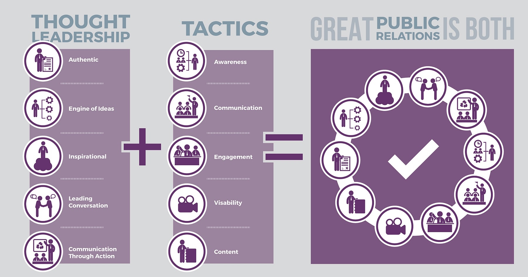 We developed a thought leadership graphic to provide a snapshot of what it takes to be considered a thought leader and what kind of marketing tactics should accompany these actions. The interesting thing is that when you distill these ideas and get to the essence of this title, it all goes right back to public relations. All of these tactics reside under the umbrella of good, old-fashioned PR. Thought Leadership is just a fancy new title for those who are actually really effective with their public relations efforts.